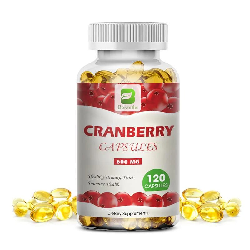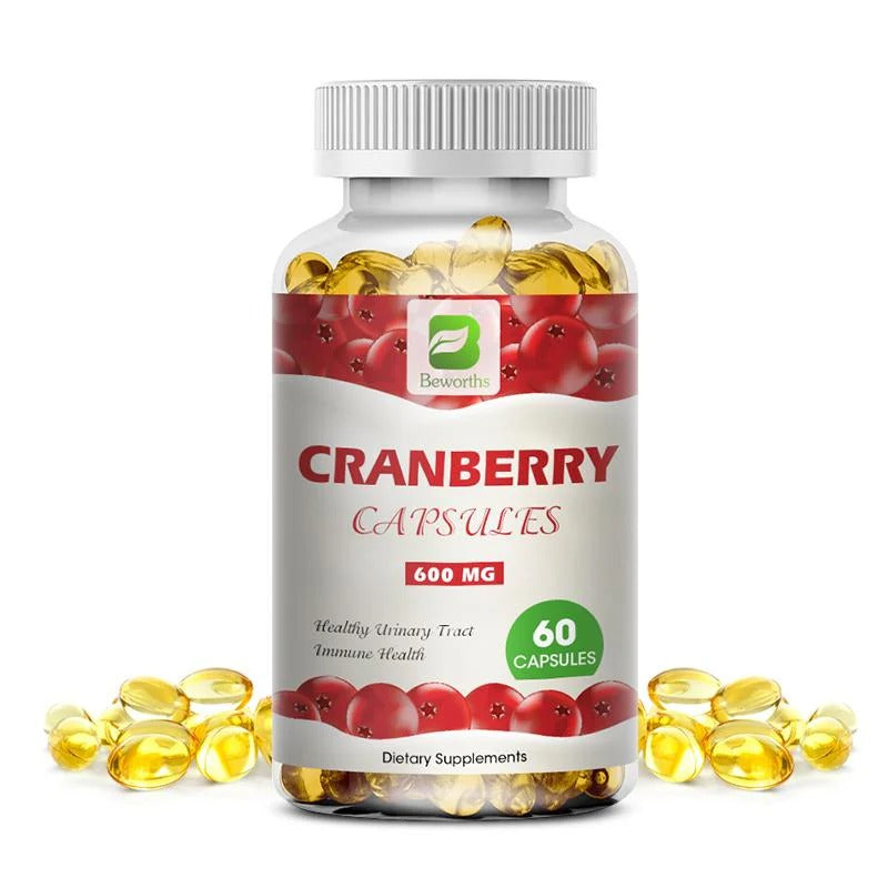 Maximum Strength: BEWORTHS Cranberry Capsules 600 mg, each containing other herbs. Cranberries are a notoriously rich and healthy fruit, made naturally, with polyphenols and other natural antioxidants. With a high concentration of vitamin C, cranberries provide detoxifying qualities, help maintain pH balance within the normal range, and support urinary tract health and bladder support; with no side effects.