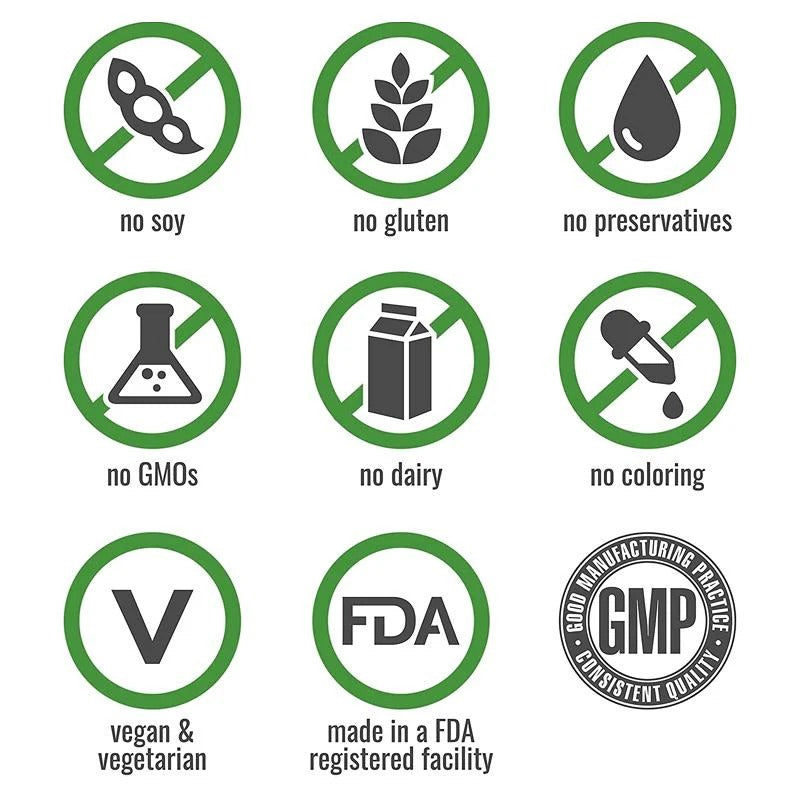 Premium Quality: Non-GMO, Gluten Free, Soy Free, Vegan & Vegetarian, with NO Coloring, Flavoring, or Preservatives.