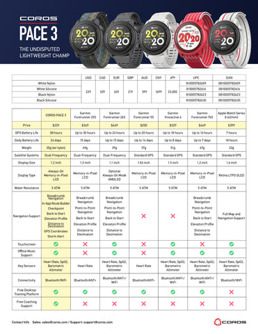 Size and Weight Dimensions 41.9 x 41.9 x 11.7mm Height does not include the optical heart rate sensor Weight 39g With Silicone Band 30g With Nylon Band Display Display Size 1.2 Inch Display Resolution 240 x 240 64 colors Display Type Touch Screen Always-On Memory LCD Materials Screen Material Mineral Glass Bezel Material Fibre Reinforced Polymer Cover Material Fibre Reinforced Polymer Band Material Silicone / Nylon Watch Band Width 22mm Size - Nylon 135mm - 205mm (Standard) 150mm - 235mm (Long) Size - Silicone 130mm - 215mm Installation Type Quick Release Design Buttons & Dials Digital Dial Back Button — Connectivity Phone Bluetooth Accessories Bluetooth Data Sync Wi-Fi / COROS App Durability Water Resistance 5 ATM Suitable for surface water activities and not for diving Working Temperature -4°F to 122°F (-20°C to 50°C) Storage Temperature -4°F to 140°F (-20°C to 60°C) Battery Standard Full GPS (GPS/QZSS) 38 Hours Connects to GPS and QZSS 10 Hours (With Music) Connects to GPS and QZSS with offline music All Systems On (GPS, GLONASS, Galileo, Beidou, QZSS) 25 Hours Connects to 5 satellite systems at the same time 9 Hours (With Music) Connects to 5 satellite systems at the same time with offline music Dual Frequency (GPS, GLONASS, Galileo, Beidou, QZSS) 15 Hours Connects to 5 satellite systems at the same time in dual frequency 7 Hours (With Music) Connects to 5 satellite systems at the same time in dual frequency with offline music Daily Use 17 Days With daily and sleep tracking 15 Days (With Daily Stress) Monitors your stress level throughout the day Charging Time Less Than 2 Hours Memory Internal Memory 4GB Activity Memory 1200 Hours Estimates based on outdoor activities Geo Location Satellite Systems GPS, GLONASS, Galileo, Beidou, QZSS GNSS Chipset All-Satellite Dual-Frequency Navigation Map Layer Breadcrumb — Additional Features Checkpoint Back-To-Start Deviation Alert Touchscreen-Enabled Map Control Data Tracking Sensors Optical Heart Rate Monitor May not work over tattoos Barometric Altimeter Accelerometer Gyroscope 3D Compass Thermometer Supports body temperature in training (with compatible accessory) Optical Pulse Oximeter — Training Features Resting Heart Rate Underwater Heart Rate Action Camera Control Supports select GoPro and Insta360 cameras Virtual Pacer Virtual Run Running Form Test Requires COROS POD/POD 2 Altitude Mode Regular evaluation of SpO2 and fitness when at high altitudes Touch Scroll Swipe to scroll data pages during training Extender Daily Features Stopwatch Daily Alerts Include active calories, exercise time, storm and more alerts Updateable Firmware With Wi-Fi and the COROS app Find My Phone Find My Watch Backlight Always-On Mode HRV Music Plays offline music when paired with supported Bluetooth headsets 3rd Party Integration Compatible Apps Nike Run Club, Komoot, TrainingPeaks, Strava, Relive, adidas Running, Apple Health, Stryd, Final Surge, Runalyze, Running Quotient, Decathlon Click here for a complete list System Languages Display Language English, Simplified Chinese, Traditional Chinese, German, Spanish, French, Polish, Thai, Japanese, Korean, Portuguese, Italian, Russian