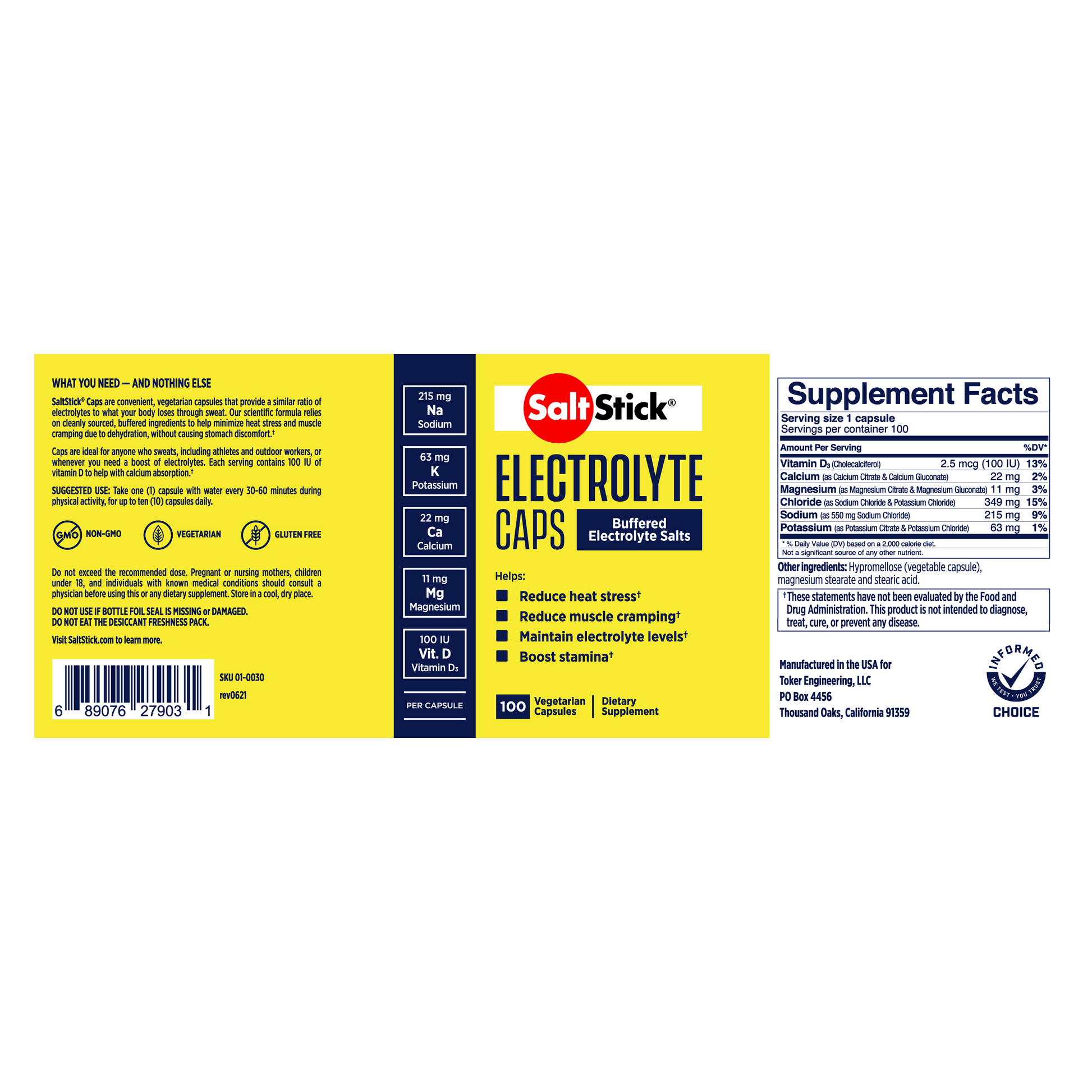 SaltStick® Caps are convenient, vegetarian capsules that provide a similar ratio of electrolytes to what your body loses through sweat. Our scientific formula relies on cleanly sourced, buffered ingredients to help minimize heat stress and muscle cramping due to dehydration, without causing stomach discomfort. Caps are ideal for anyone who sweats, including athletes and outdoor workers, or whenever you need a boost of electrolytes. Each serving contains 100 IU of Vitamin D to help with calcium absorption.
