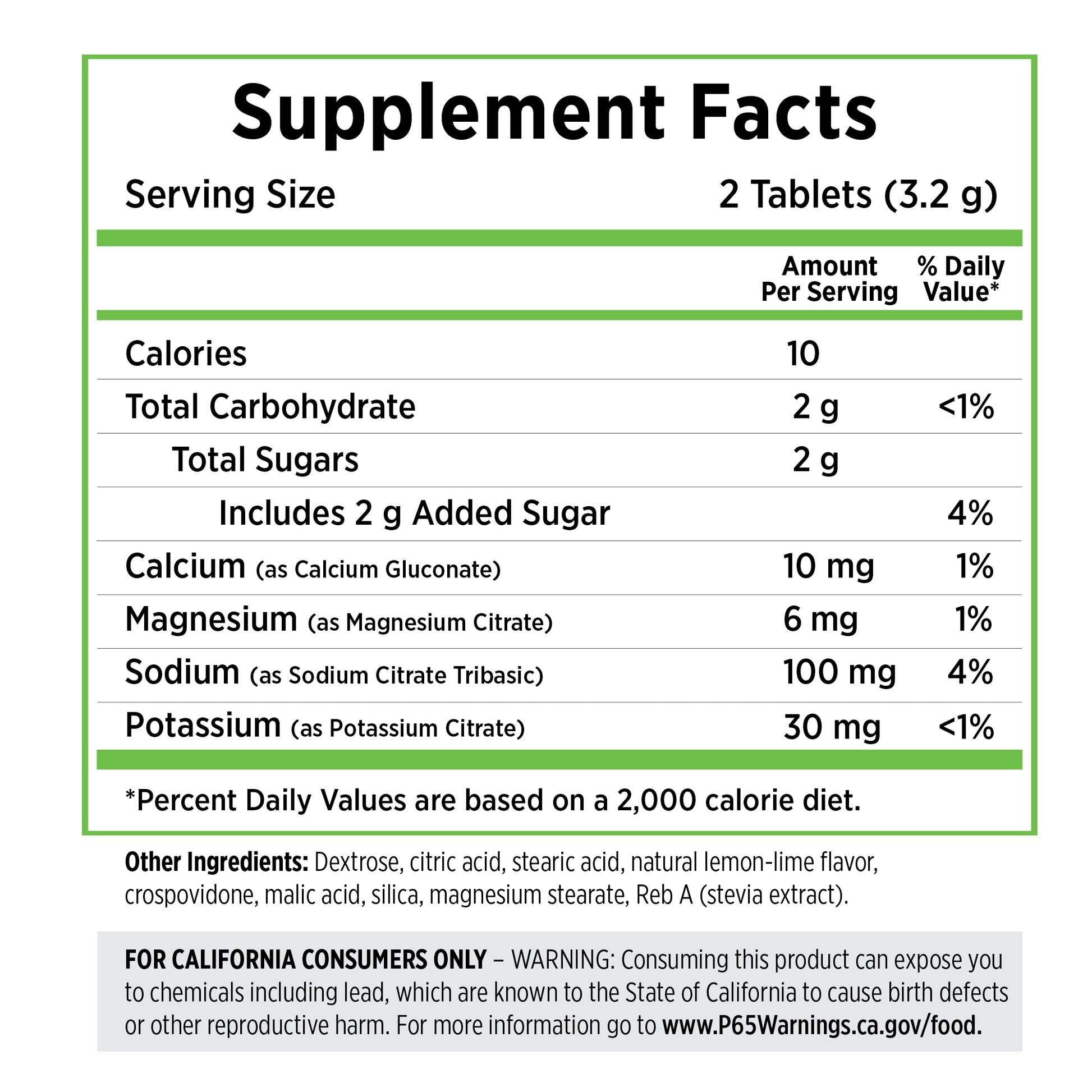Other ingredients: Dextrose,  citric acid, stearic acid, natural lemon-lime flavor, crospovidone,  malic acid, silica, magnesium stearate, Reb A (stevia leaf extract)