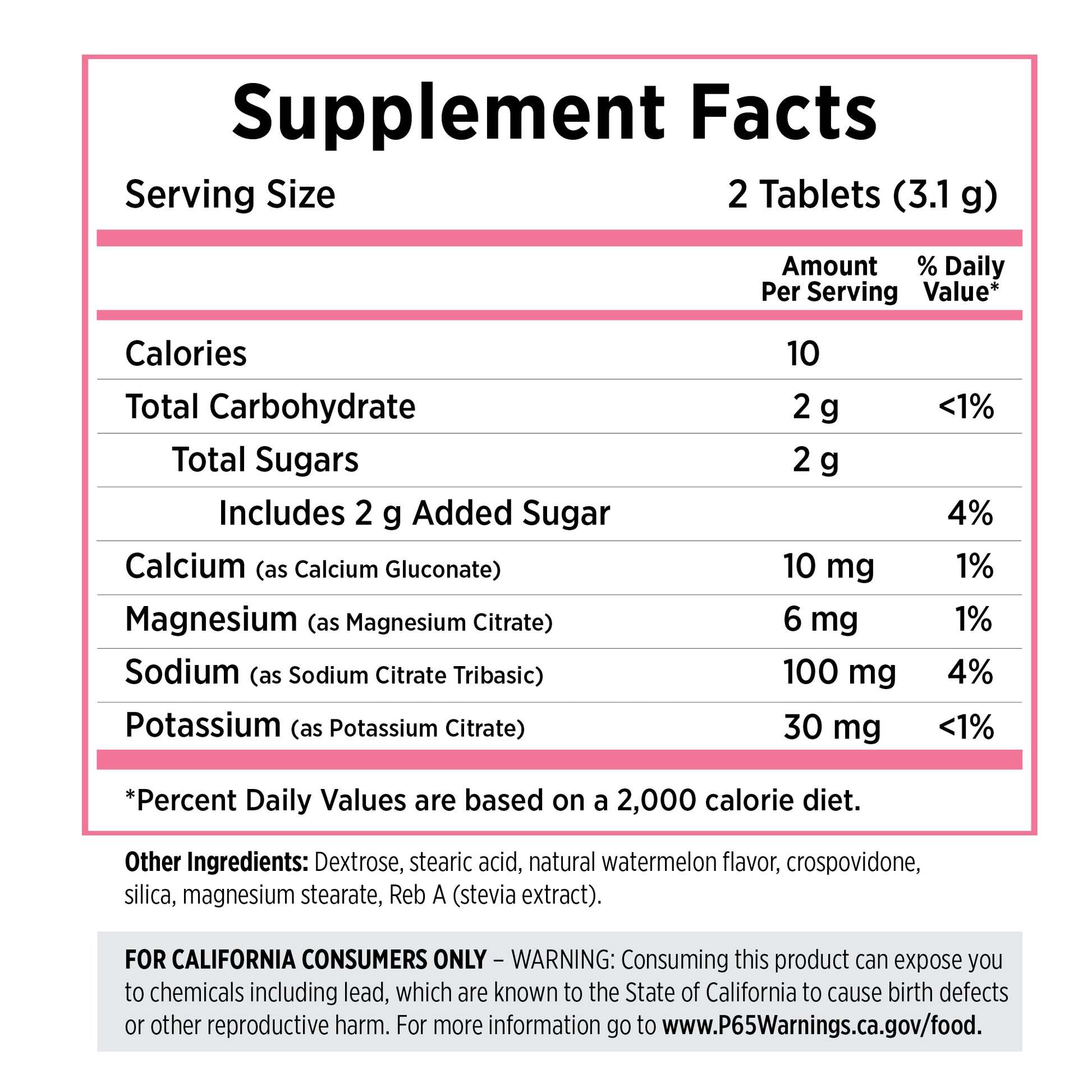 Other ingredients: Dextrose, stearic acid, natural watermelon flavor, crospovidone, silica, magnesium stearate, Reb A (stevia leaf extract)